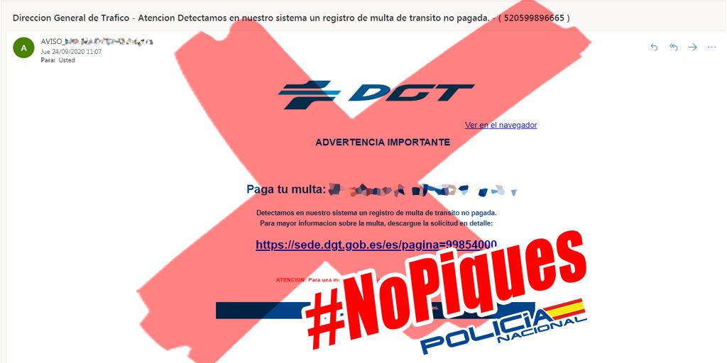 El Cuerpo Nacional de Policía desde su cuenta de Twitter ha explicado el nuevo engaño. Se trata de un correo electrónico donde se informa de una supuesta multa de la dirección general de tráfico y dónde se puede abonar la multa pinchando en un enlace.