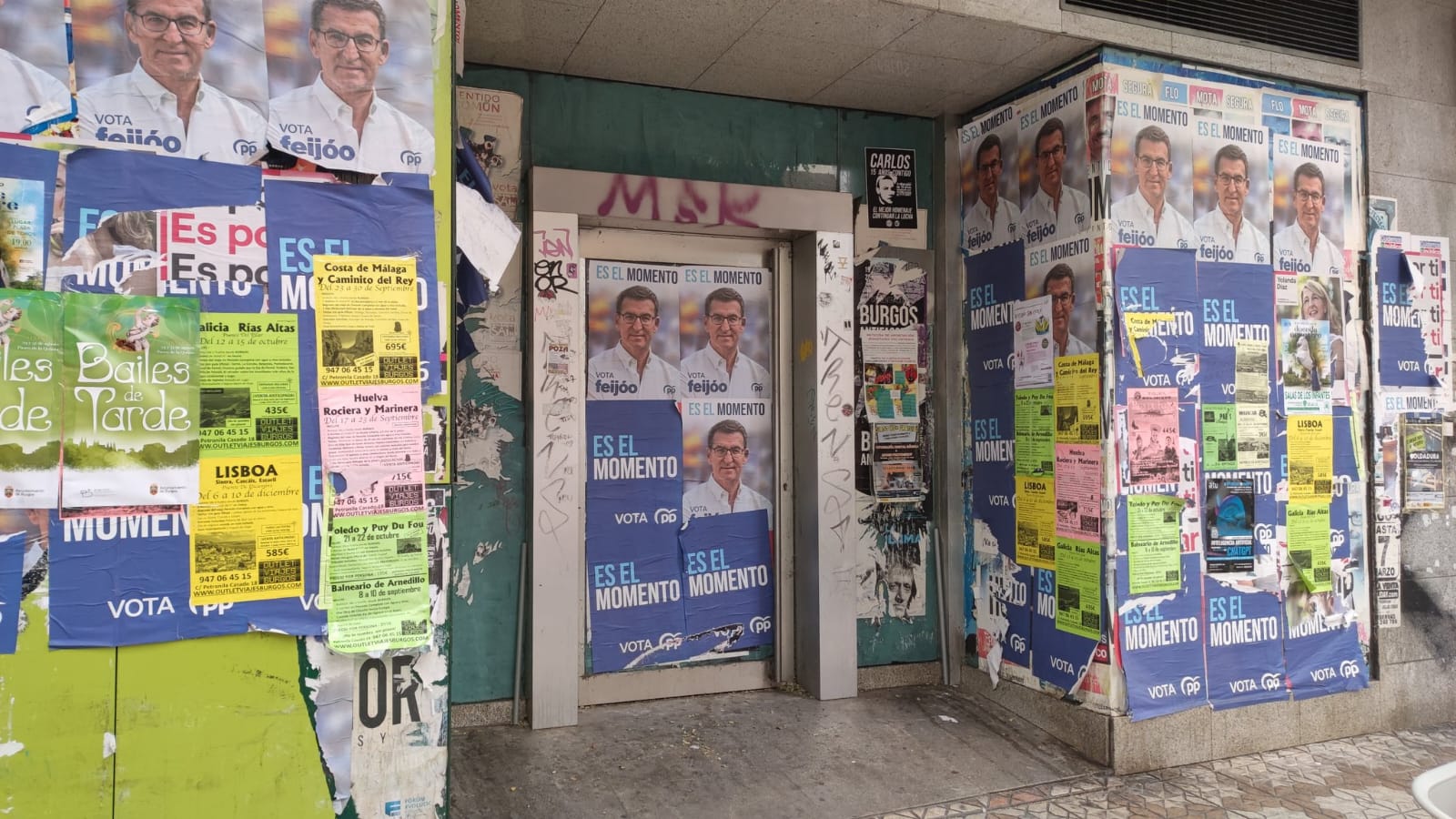 En una de las fotos se puede ver que los carteles se han puesto en un escaparate de una tienda cerrada (propiedad privada) y que dentro de unos días se llenará con otros carteles. Otra de las fachadas se encuentra en pleno centro de la ciudad, donde se situaba una entidad financiera y cuya imagen es "lamentable".