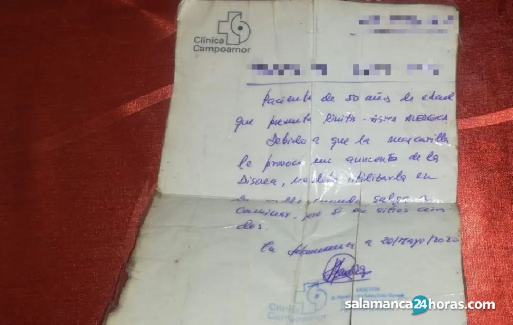 Rinitis ? Asma Alérgica, es la enfermedad que recoge el justificante que este salmantino lleva siempre consigo para evitar problemas y sanciones con la policía. El asma y la rinitis alérgica son dos enfermedades que afectan al sistema respiratorio y que son bastante frecuentes entre la población y pese a que ambas patologías cuentan con sus propias guías de diagnóstico y tratamiento, es frecuente que se produzcan al mismo tiempo. Esto ha dado lugar a la hipótesis de que se trata de dos polos opuestos de una misma enfermedad cuya principal característica es el proceso inflamatorio crónico de una única vía aérea.