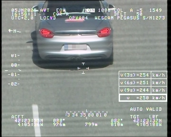 El infractor circulaba a 250 km/h por la autovía A-231, cuando la genérica de la vía es de 120 Km/h. La velocidad fue detectada por el cinemómetro del helicóptero PEGASUS de la DGT. Fue parado más adelante con el apoyo desde tierra de una patrulla del Subsector de Tráfico de la Guardia Civil de Burgos