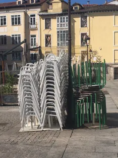 Como muestran las imágenes se apilan sillas y mesas junto a la nueva mampara que es la salida del garaje de los peatones. O junto a las farolas se apilan sillas con una altura considerable.