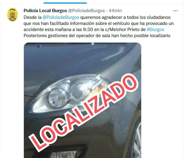 Pocos minutos después la Policía local agradecía a través de su cuenta de twitter toda la información y la colaboración ciudadana que había hecho posible la localización del vehículo.