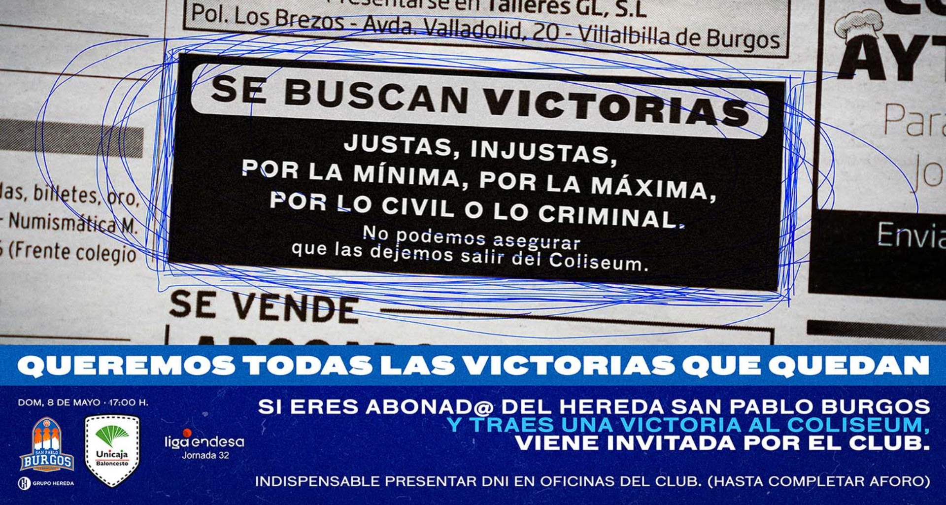 Cada abonado trae una Victoria. El Hereda San Pablo Burgos lanza una promoción especial bajo el lema 'Queremos todas las Victorias que quedan', con la que quiere invitar a las Victorias al Coliseum para el encuentro ante Unicaja de este domingo, a las 17:00 horas. Los de Paco Olmos pelearán por su décimo triunfo de la temporada en la Liga Endesa en un duelo vital en la búsqueda de la permanencia.