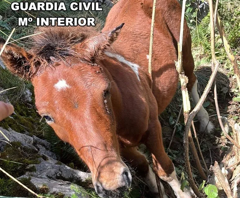 La Guardia Civil ha rescatado a un potro de seis meses de edad, que quedó atrapado entre un árbol y la peña desde la que se precipitó al vacío desde una altura de 8 metros.