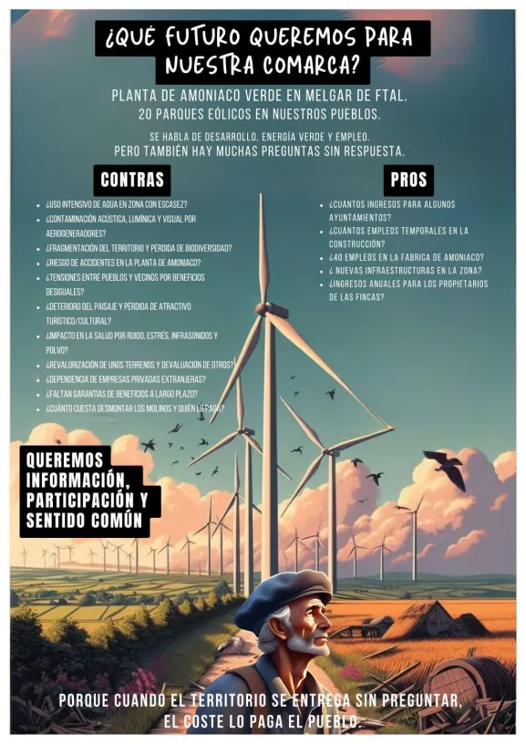 El sábado 19 de abril a las 18:00 horas, en Ayuntamiento de Guadilla de Villamar se organiza una reunión informativa abierta a todos los vecinos, donde se presentará y debatirá el proyecto que contempla la construcción de una fábrica de amoniaco verde y la instalación de 20 parques eólicos en la comarca.