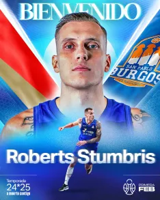 Roberts Stumbris (09/07/1993, Saldus, Letonia) se incorpora al juego int erior del Silbö San Pablo Burgos para disputar el curso 2024/25 de Primera FEB y de Copa España. El ala pívot de 2,00m ha sido internacional con la selección letona y dispone de experiencia en primeras ligas europeas, así como en la FIBA Europe Cup.