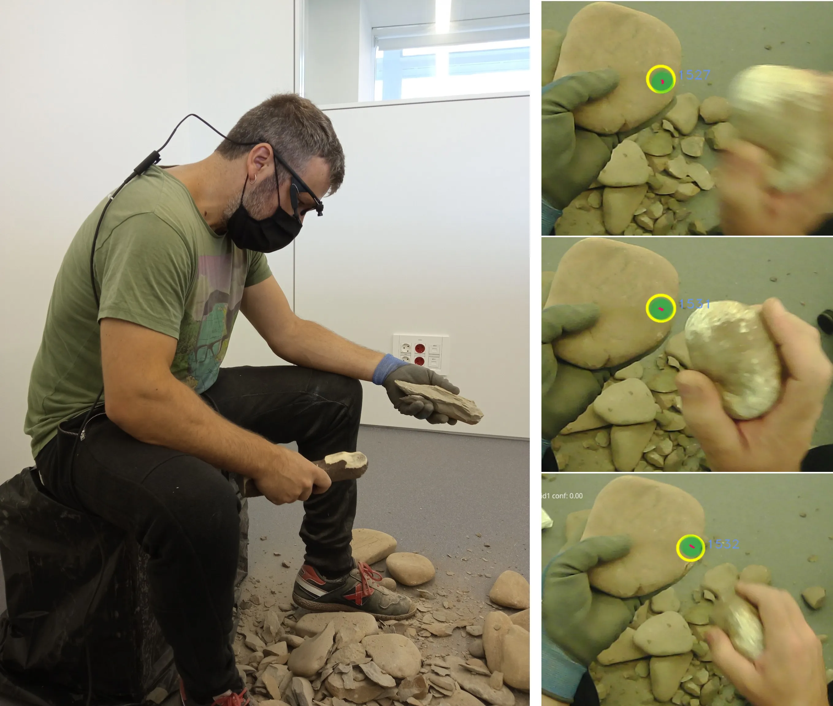 En este trabajo experimental, un tallador llevaba colocadas gafas de seguimiento ocular o eye tracking para registrar la dirección de la mirada durante todo el proceso de elaboración de las herramientas paleolíticas: choppers y bifaces. El seguimiento ocular es la técnica que registra la posición de la mirada y permite cuantificar la atención visual dirigida a una escena. Esta metodología se ha establecido como enfoque eficaz para investigar el sistema visoespacial y abordar la cognición humana desde una perspectiva evolutiva.