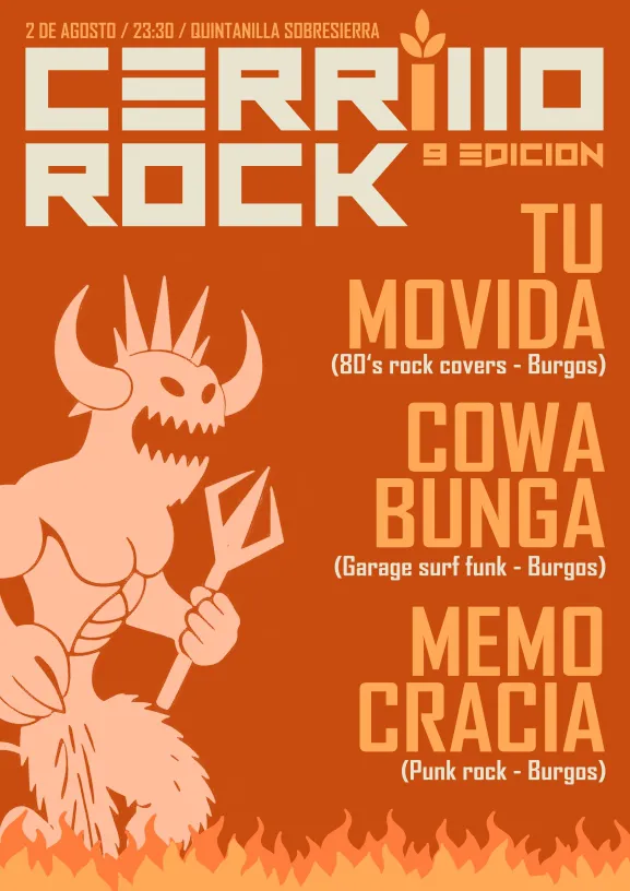 El viernes 2 de agosto en Quintanilla Sobresierra (Burgos) se organiza la 9º edición del Cerrillorock a las 23:30 horas.