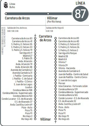 También se retoma el servicio Búho de autobuses urbanos desde el día 16, que circularán las noches de los viernes, sábados y vísperas de festivos en las líneas 87 y 88. La línea 87, además, modifica su recorrido entre carretera Poza y avenida Islas Canarias para mejorar el servicio prestado en el barrio de Vista Alegre, S3 y Príncipe de Asturias.