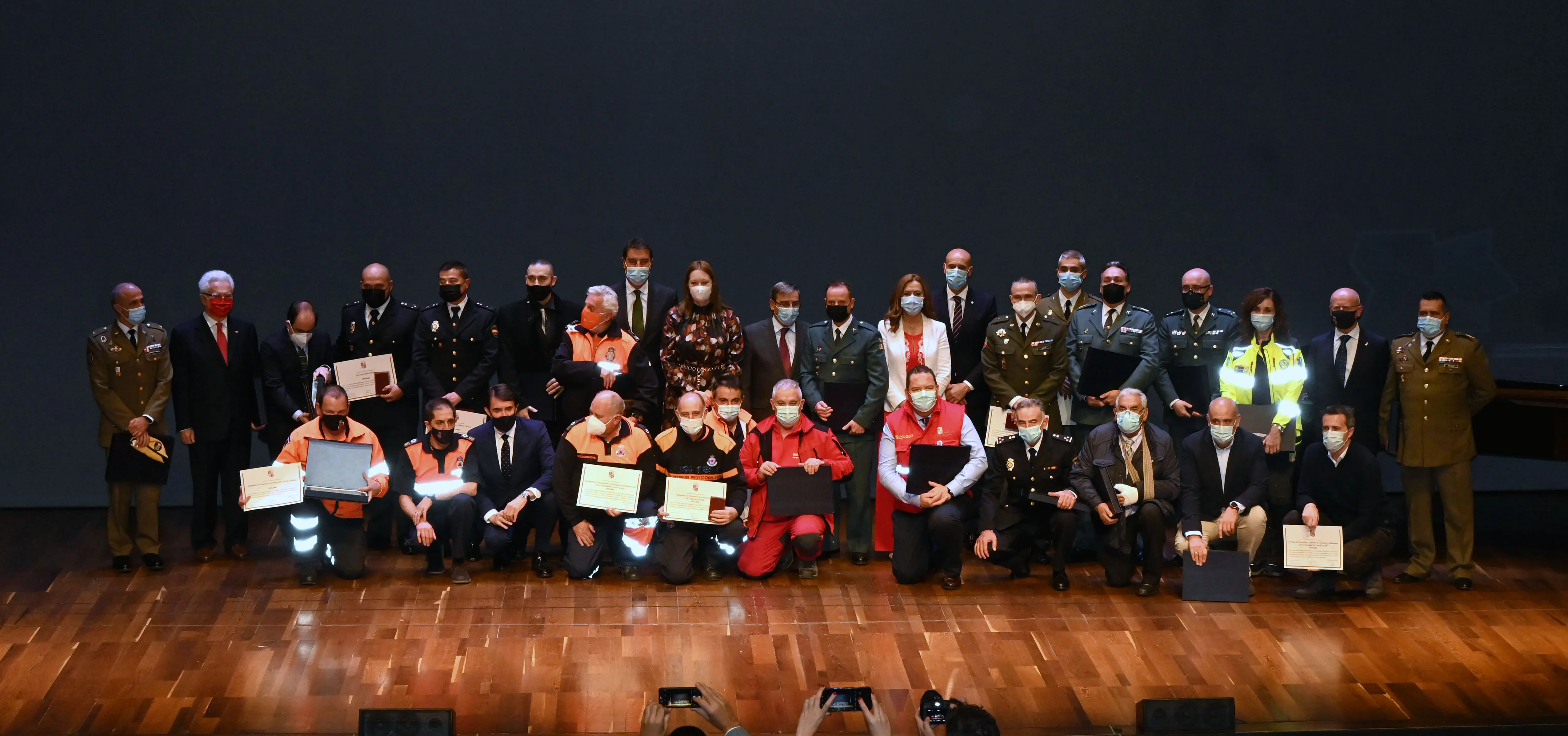 La Junta ha entregado tres medallas de oro, dos medallas de plata y veinte menciones honoríficas al mérito de la Protección Ciudadana, que reconocen la labor de asociaciones y agrupaciones de Voluntarios, Servicios de Extinción de Incendios, policías nacionales, guardias civiles, ejército, ciudadanos, colectivos de protección civil, Cruz Roja, Secretariado Gitano, personal de las delegaciones territoriales, SAMUR, UME, UALE (Unidad de Apoyo Logístico en Emergencias), que han prestado una labor de auxilio y atención directa a las personas.