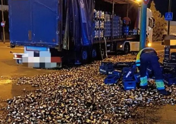 La causa del suceso se ha debido a la colocación de una estiba de forma incorrecta a la hora de distribuir la carga en el camión, lo que ha provocado que cientos de botellines de cerveza cayeran del vehículo y se rompiesen al impactar en el suelo.