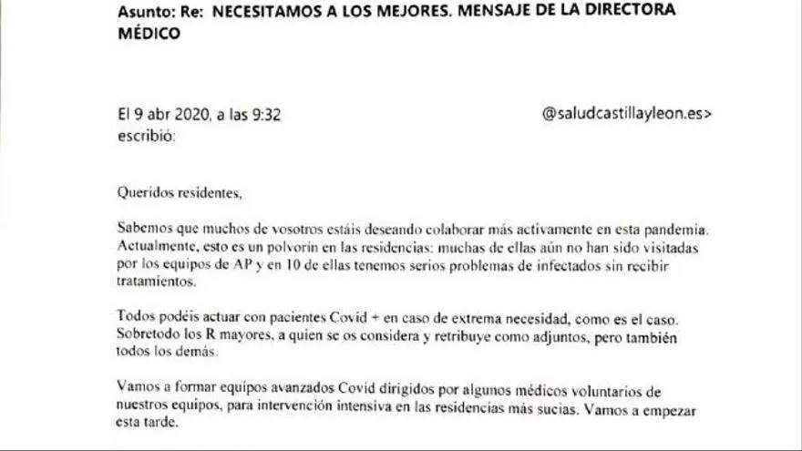 Un correo de la directora médica de la Gerencia de Salud Valladolid Este, escrito durante el pico de la pandemia, pone al descubierto la realidad de la gestión sanitaria que se llevó a cabo en las residencias de ancianos de Castilla y León: hubo centros donde los enfermos no recibían ni atención médica ni tratamiento. El pasado 9 de abril, la doctora envió un email a la coordinadora de Formación ?con el asunto 'Necesitamos a los mejores'? en el que pedía a los médicos residentes que acudiesen a los centros de personas mayores.