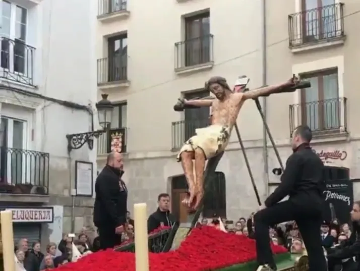 La talla del Cristo de las Gotas ha sufrido una caída al comienzo de la procesión que comienza en San Gil. Mientras turistas y burgaleses observaban cómo levantaban al cristo colgado para dar comienzo el acto, éste se ha inclinado demasiado y ha provocado que cayera hacia delante, frente a los cientos de ojos y móviles que grababan el momento.