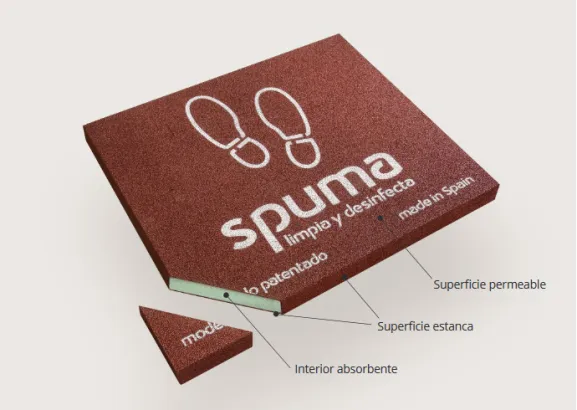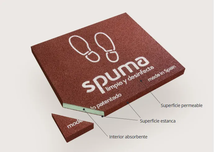 A diferencia de otros felpudos anti-COVID que podemos encontrar en el mercado, SPUMA consigue un "efecto ventosa" cuando el zapato se retira. Esto permite que la impregnación sea la justa para que el desinfectante actúe de una manera efectiva. Otros felpudos constan de dos partes: una en la que se humedece el calzado y otra en la que se seca. Sin embargo, los desinfectantes necesitan de un tiempo de actuación para conseguir sus objetivos, y, si se seca al instante, el resultado no es eficaz.