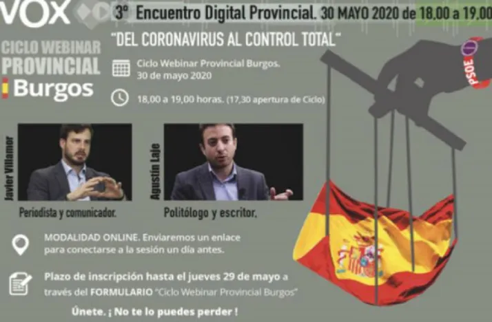 Vox asegura que "debido al interés que ha suscitado y respondiendo a la gran motivación, el 3º Encuentro Digital Provincial estará abierto al público en general que deseen participar de esta oportunidad, que desde Burgos organizan poniendo al alcance los ponentes invitados que hacen que resulte un Webinar de calidad".