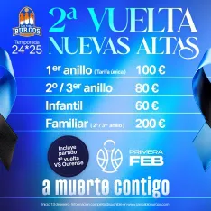 Los aficionados que quieran abonarse a la segunda vuelta en el Coliseum podrán hacerlo a partir del lunes 13 de enero, únicamente de forma presencial en la oficina del San Pablo Burgos (avenida de la Paz, 7, Bajo, Planta -1ª), en horario de lunes a jueves, de 10:00 a 14:00 y de 16:00 a19:00 horas, y los viernes, de 10:00 a 14:00 horas.