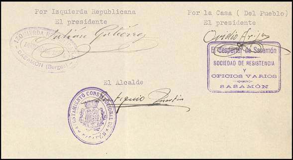 «Que, desde el día 16 de febrero, vienen siendo perseguidos, acorralados y amenazados de muerte por los elementos fascistas de esta villa, ante la pasibilidad e indiferencia de la Guardia Civil del puesto de Sasamón y siguen contando que a principios de abril se celebró en Sasamón una gran concentración de izquierdas, con desfiles, mítines y arengas, que intentaron reventar jóvenes falangistas, resultando herido por arma blanca uno de ellos, Julián Rilova Calvo».